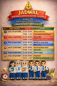 Pelaksanaan Asesmen Sumatif Akhir Tahun (ASAT) Tahun Ajaran 2025/2026 di SMP Negeri 1 Boyolali resmi dimulai pada Senin, 20 April 2026. Kegiatan ini dijadwalkan berlangsung selama enam hari, hingga Sabtu, 25 April 2026, dan diikuti oleh seluruh murid kelas IX.
