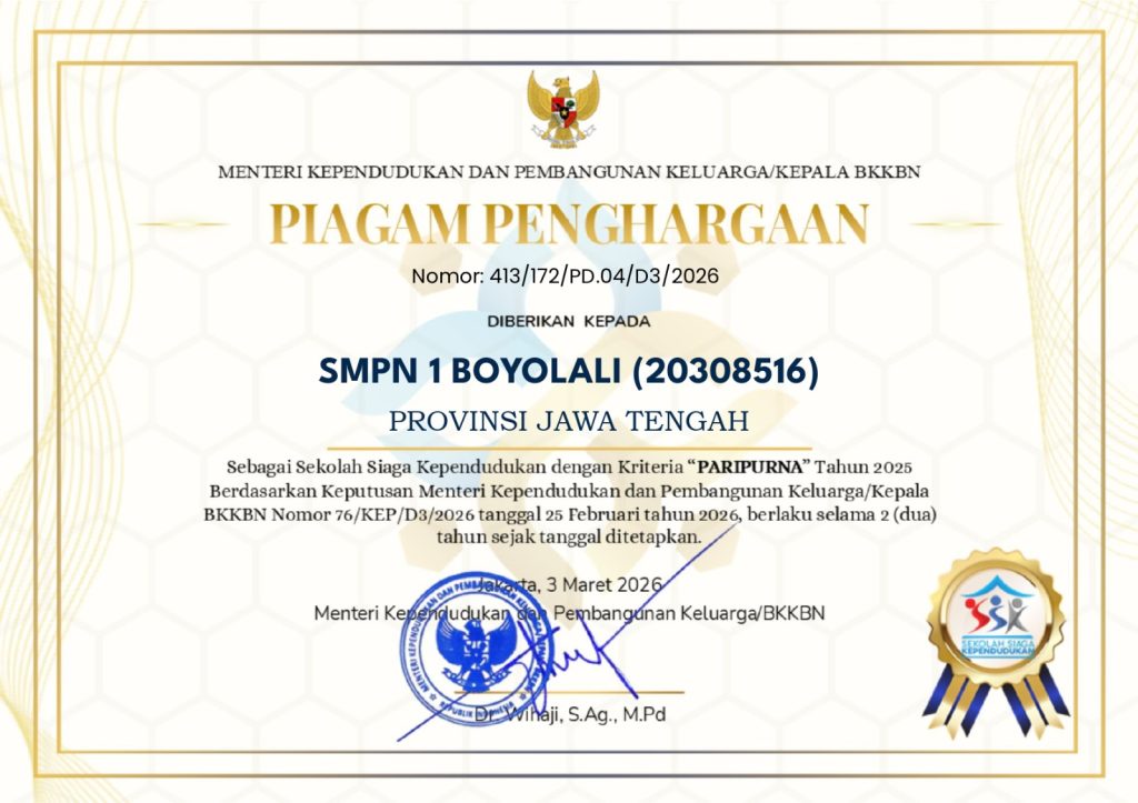 Piagam penghargaan sebagai sekolah siaga kependudukan dengan kriteria “Paripurna”
